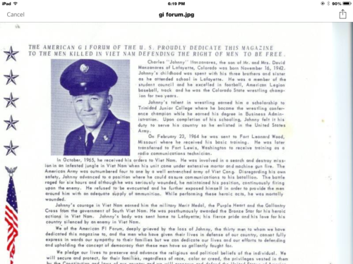 Charles “Johnny” Manzanares was a lifelong resident of Lafayette CO he excelled in wrestling (4-time state placer), football, baseball, and track at Lafayette High School.